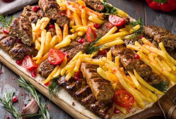 люля-кебаб баранина 3 порции, люля-кебаб говядина 3 порции, люля-кебаб курица 3 порции, овощи гриль 1, бэби картофель 1, томатный соус 3, чесночный соус 1, маринованный лук, лаваш